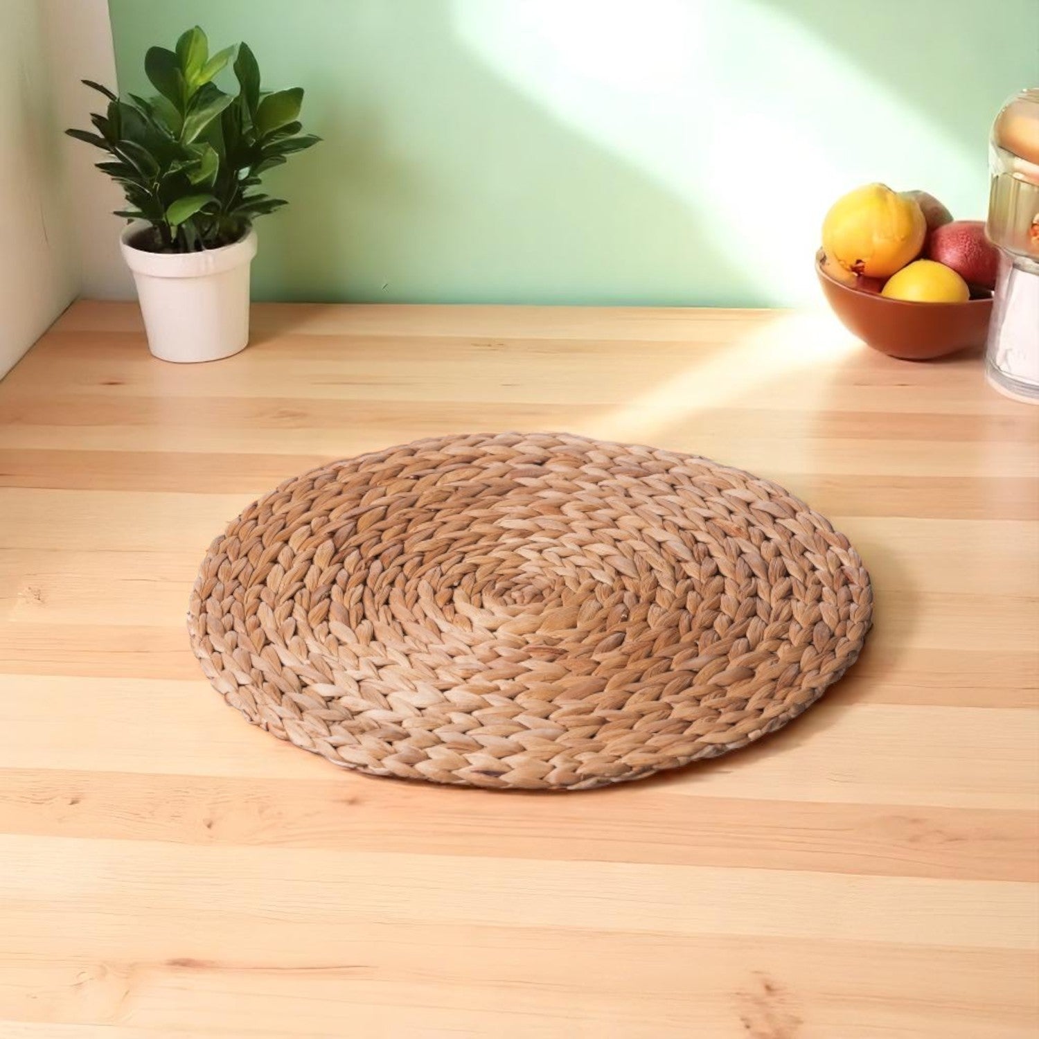 Tovaglietta rotonda in giacinto d'acqua intrecciato della linea “Naima”, ideale per aggiungere un tocco naturale ed elegante alla tavola. Perfetta per colazioni, pranzi o cene, si abbina facilmente a diversi stili di arredamento, dal rustico al moderno. Resistente e facile da pulire, protegge la superficie del tavolo con stile.
